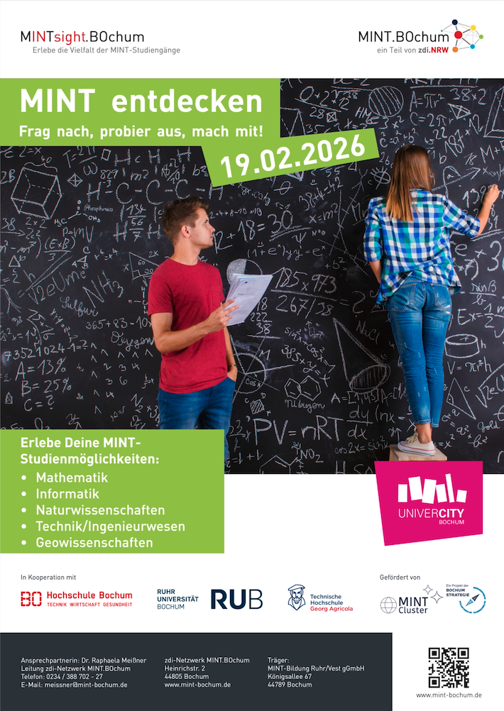 Am Donnerstag, dem 19.02.2026 wird unser großer Studienorientierungstag wieder stattfinden! Zum zweiten Mal unter neuem Namen – der BO.Ing heißt nun MINTsight.BOchum – können bis zu 300 Schülerinnen und Schüler aus Bochum und Umgebung hautnah in verschiedene MINT-Studiengänge (Mathematik, Informatik, Naturwissenschaften und Technik) eintauchen. Die Veranstaltung wird vom MINT.BOchum in Kooperation mit der Ruhr-Universität, der Hochschule Bochum sowie der Technischen Hochschule Georg Agricola organisiert.